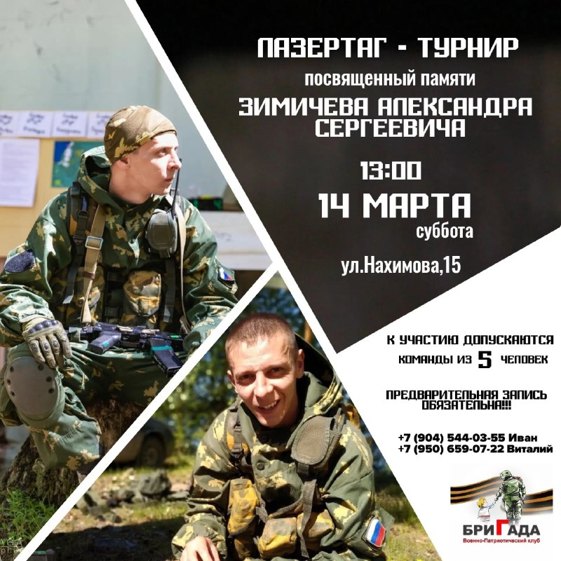 14 марта Военно-патриотический клуб «Бригада» проводит бесплатный лазертаг-турнир для всех желающих, посвященный памяти Александра Сергеевича Зимичева, погибшего на СВО!