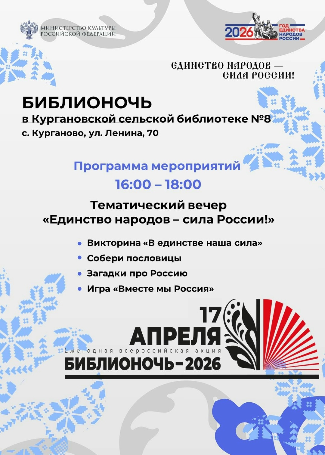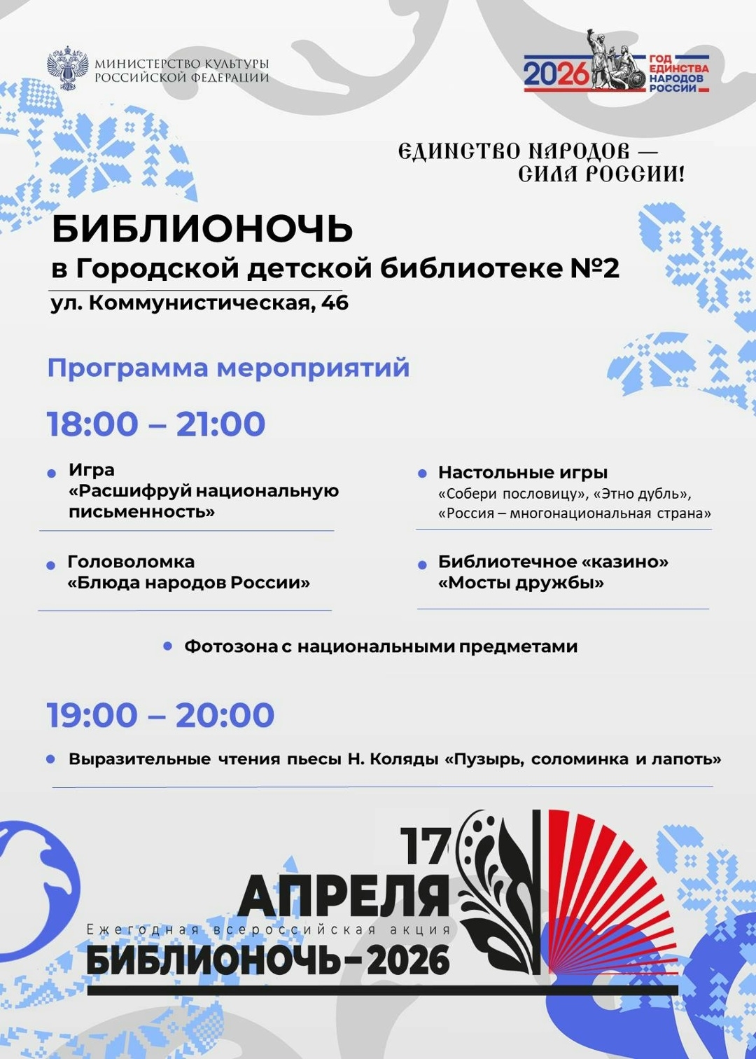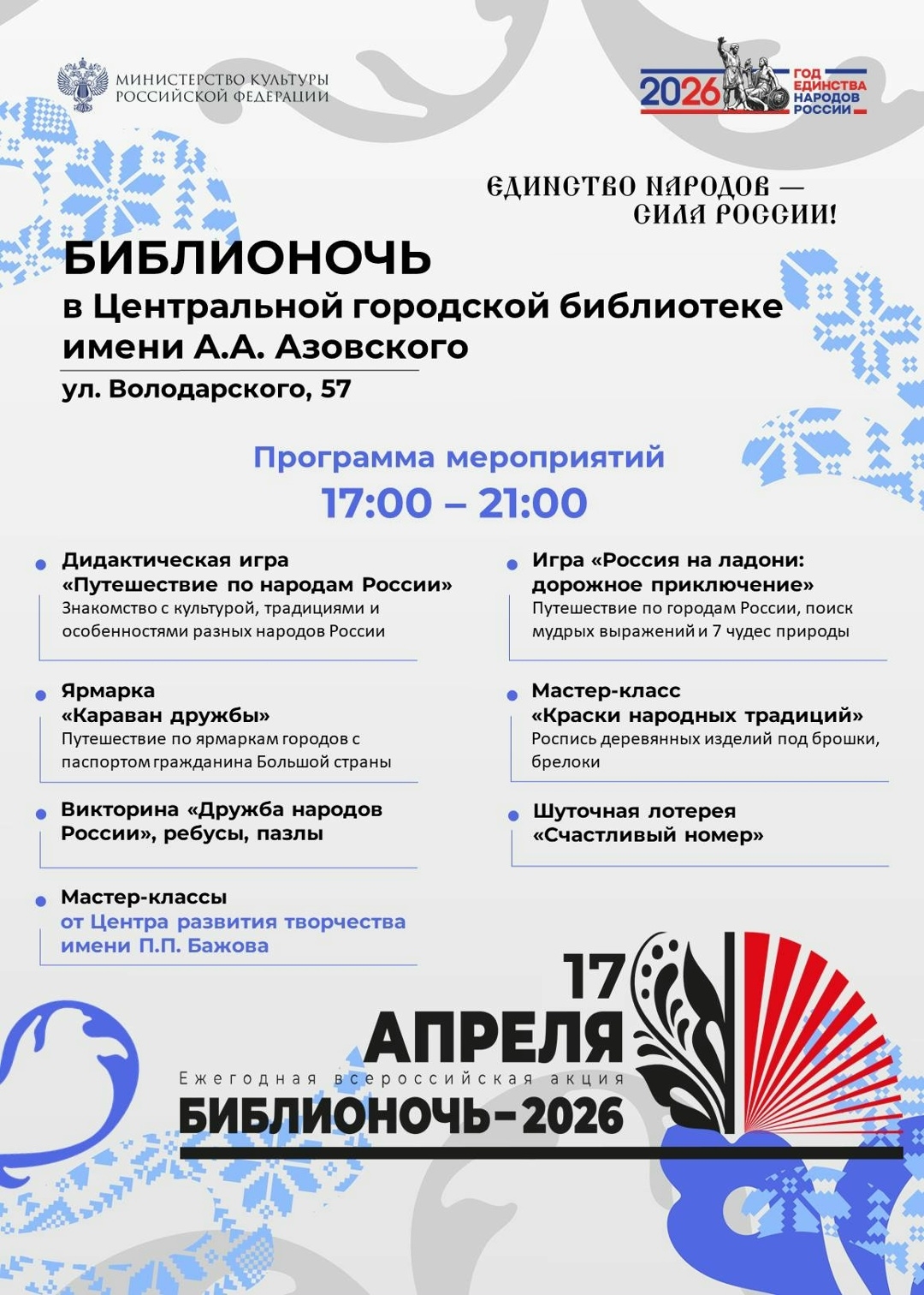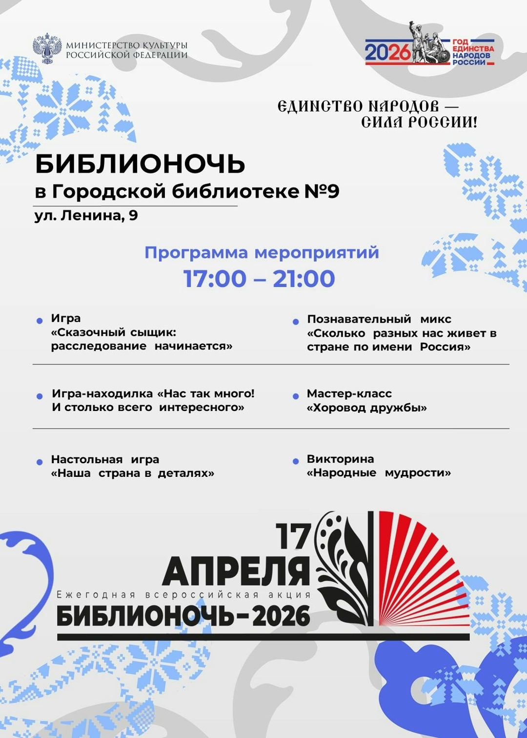 17 апреля Централизованная библиотечная система Полевского присоединится к ежегодной Всероссийской просветительской акции «Библионочь-2026», которая пройдет под девизом «Единство народов – сила России!». Библиотеки Полевского распахнут двери для всех, кто хочет отправиться в большое культурное приключение.