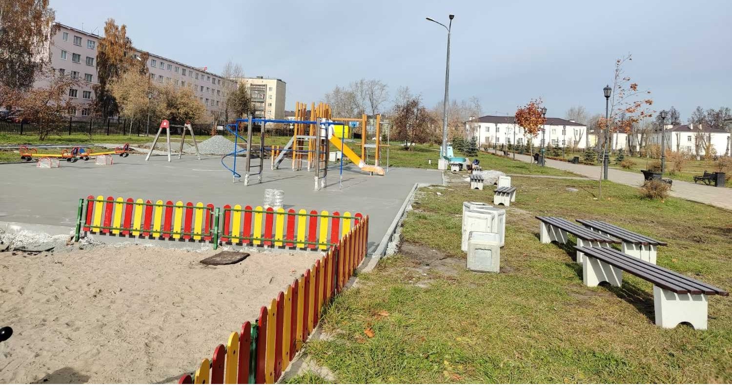 По муниципальному контракту должны заменить основания детской площадки на современное бесшовное резиновое покрытие. Также замене подлежит детский игровой комплекс, карусели, две качалки («джип», «мотоцикл»), два экскаватора в песочнице.