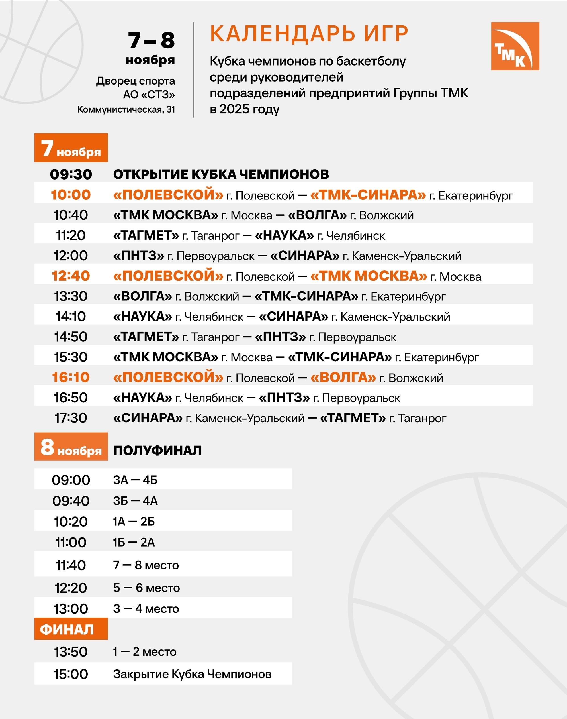На протяжении двух дней, 7 и 8 ноября, во Дворце спорта ФСК СТЗ будут проходить игры Кубка чемпионов по баскетболу среди руководителей подразделений предприятий Группы ТМК.