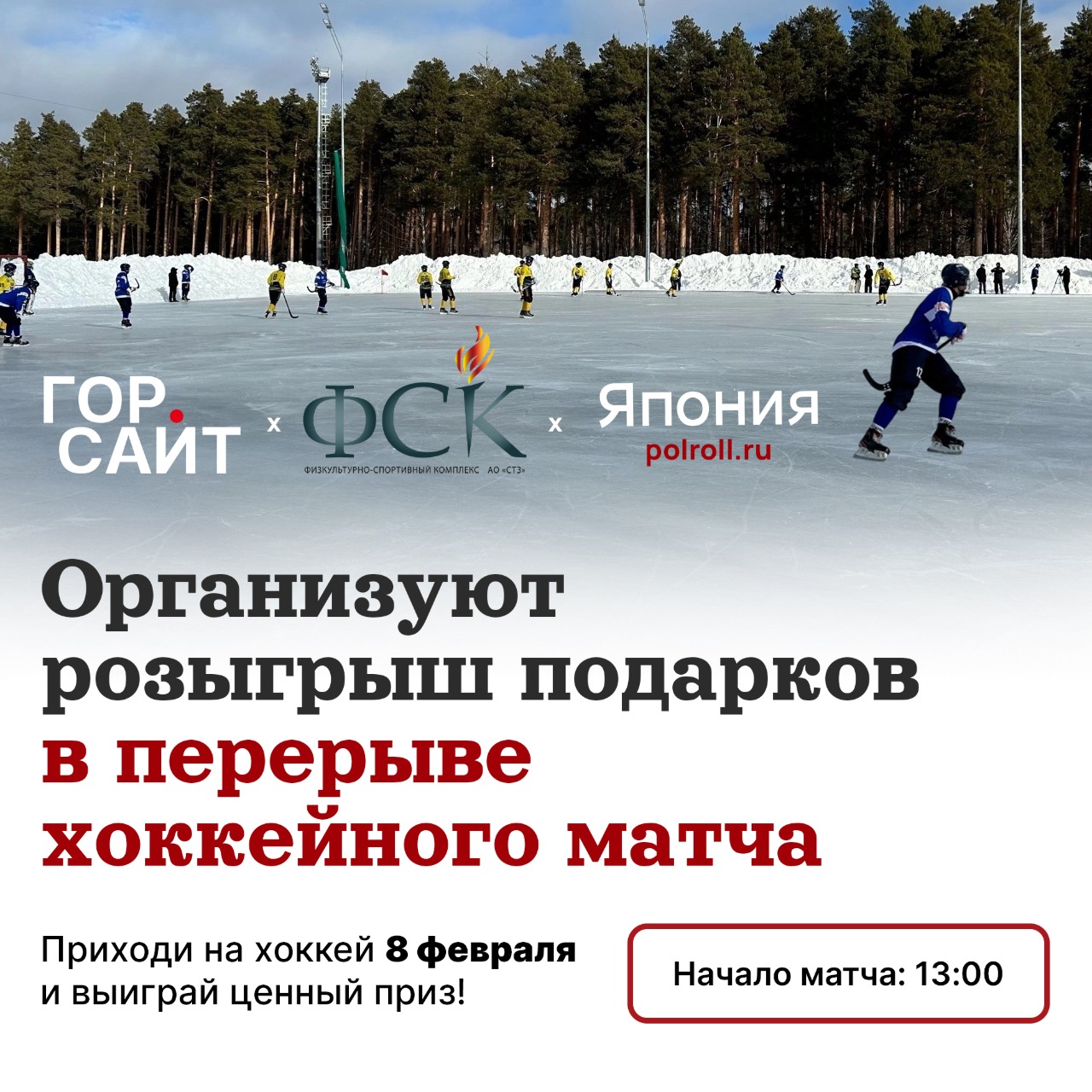 В воскресенье в перерыве матча «Северского трубника» против сборной Среднеуральска мы разыграем множество ценных подарков от сети ресторанов доставки в Полевском «Япония» и Физкультурно-спортивного комплекса АО «СТЗ».