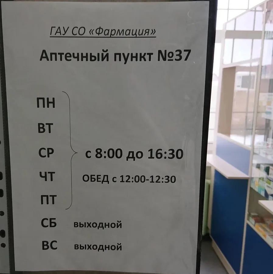Часы работы аптеки — с понедельника по пятницу с 8:00 до 16.30 часов. Обед с 12:00 до 12.30.