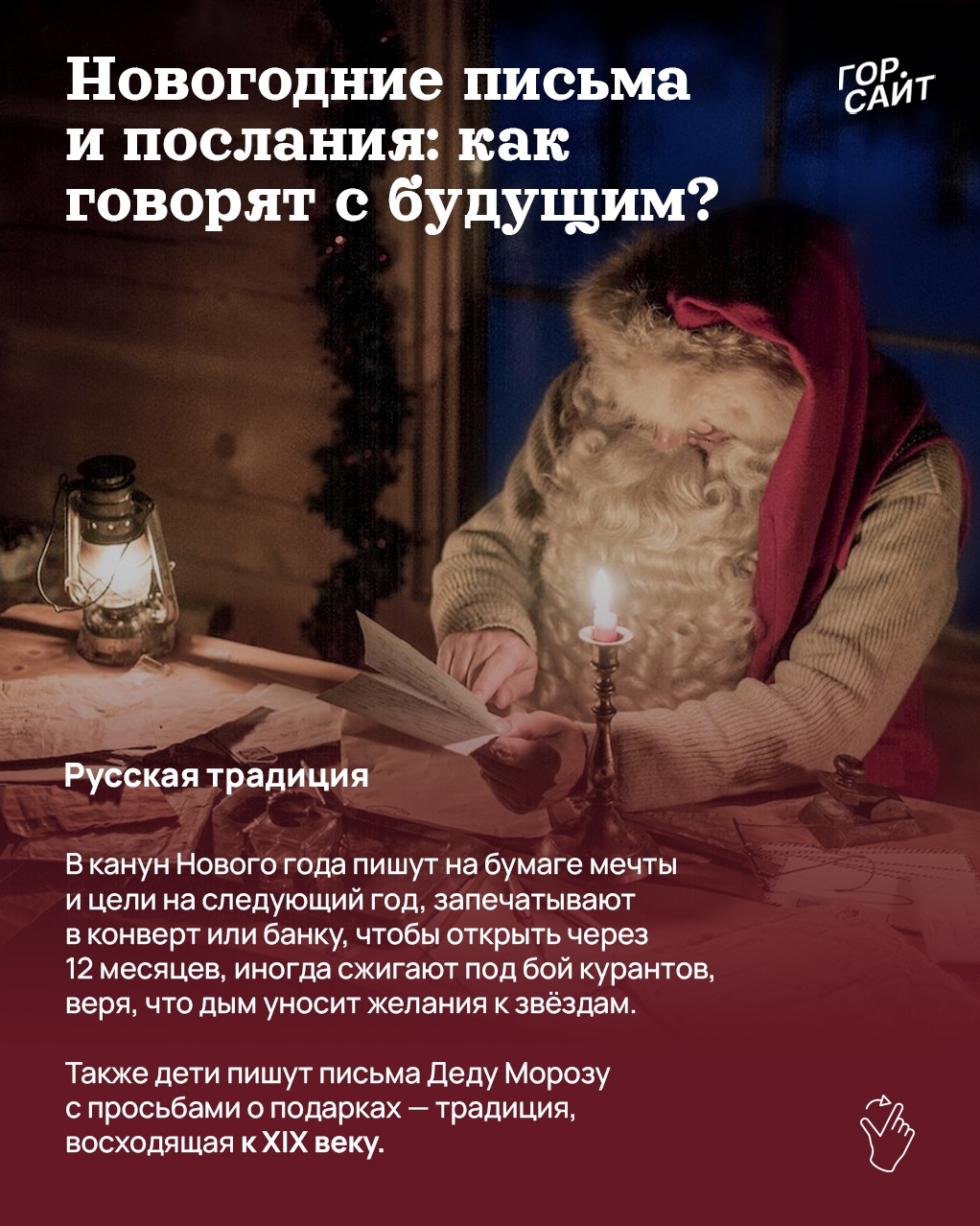 В России дети и взрослые пишут письма Деду Морозу с просьбами о подарках (традиция с XIX века) или «письма в будущее» — мечты и цели на бумаге, запечатанные в конверты или банки на год, либо сжигаемые под бой курантов, чтобы дым уносил желания к звёздам.