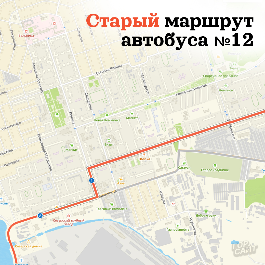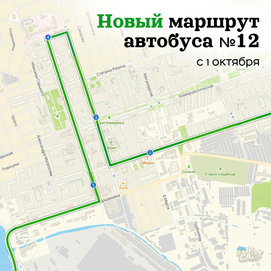 С 1 октября станет другой: Зелёный Бор – 2 — Зелёный Бор – 1 — ТЦ Палермо — школа №18 — магазин Энергия — улица Розы Люксембург — школа №13 — ЦГБ №2 — ДК СТЗ — детская поликлиника — заводоуправление СТЗ — проходная №5 — подстанция — ЗТС — Штанговая улица — поворот на Уралгидромедь — фабрика Спецодежда — ПАТП — металлофурнитурный завод — СТО — ТЦ Славутич — городская больница №1.