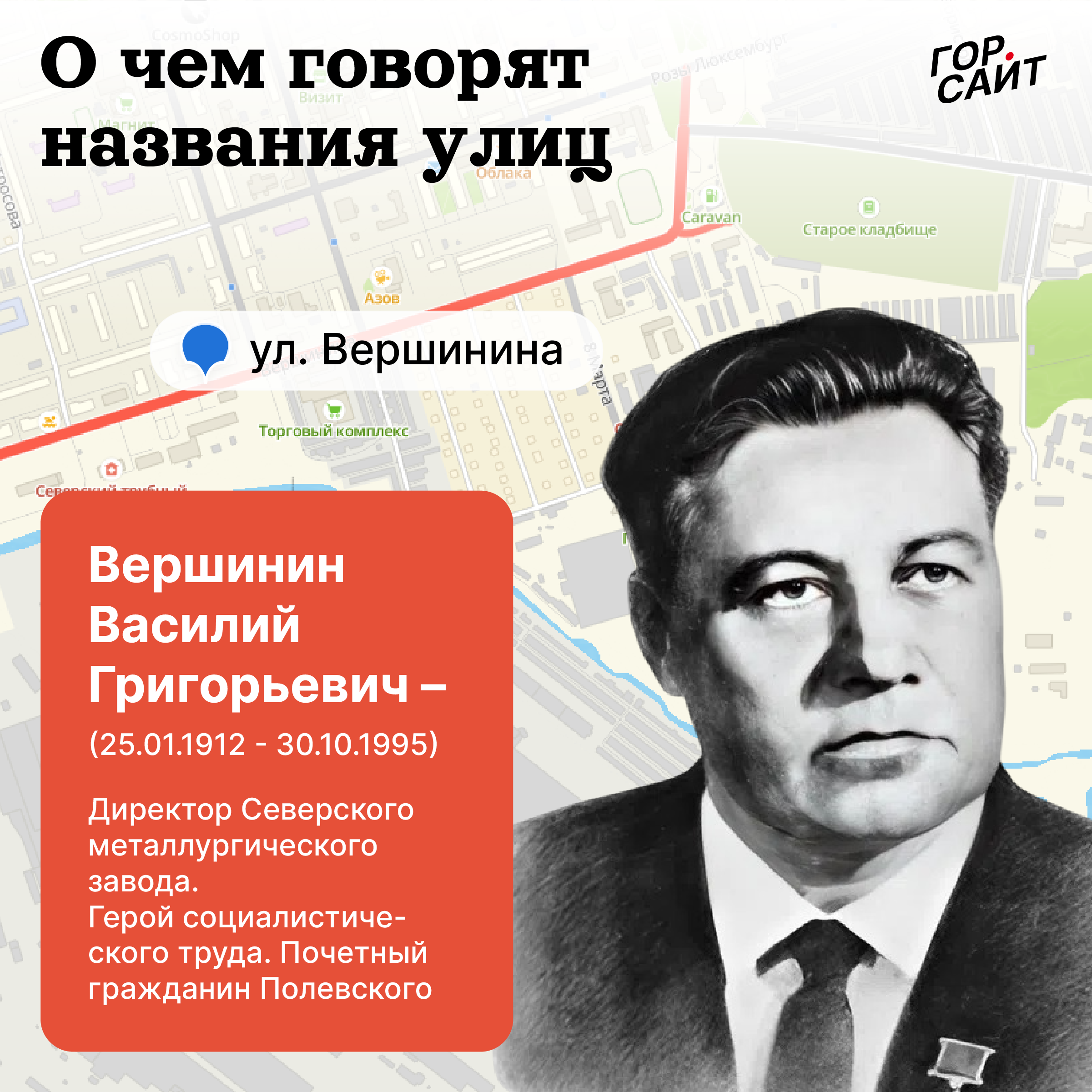 По постановлению главы администрации г. Полевского от 29 декабря 1995 года «Об увековечивании памяти бывшего директора Северского трубного завода В. Г. Вершинина» улица Пролетарская переименована в улицу Вершинина.