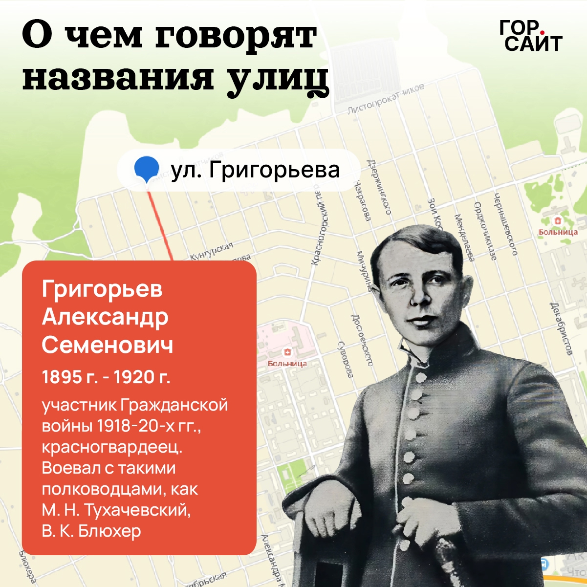 Улица Григорьева в Полевском названа в честь Григорьева Александра Семеновича– участник Гражданской войны 1918-20-х гг.