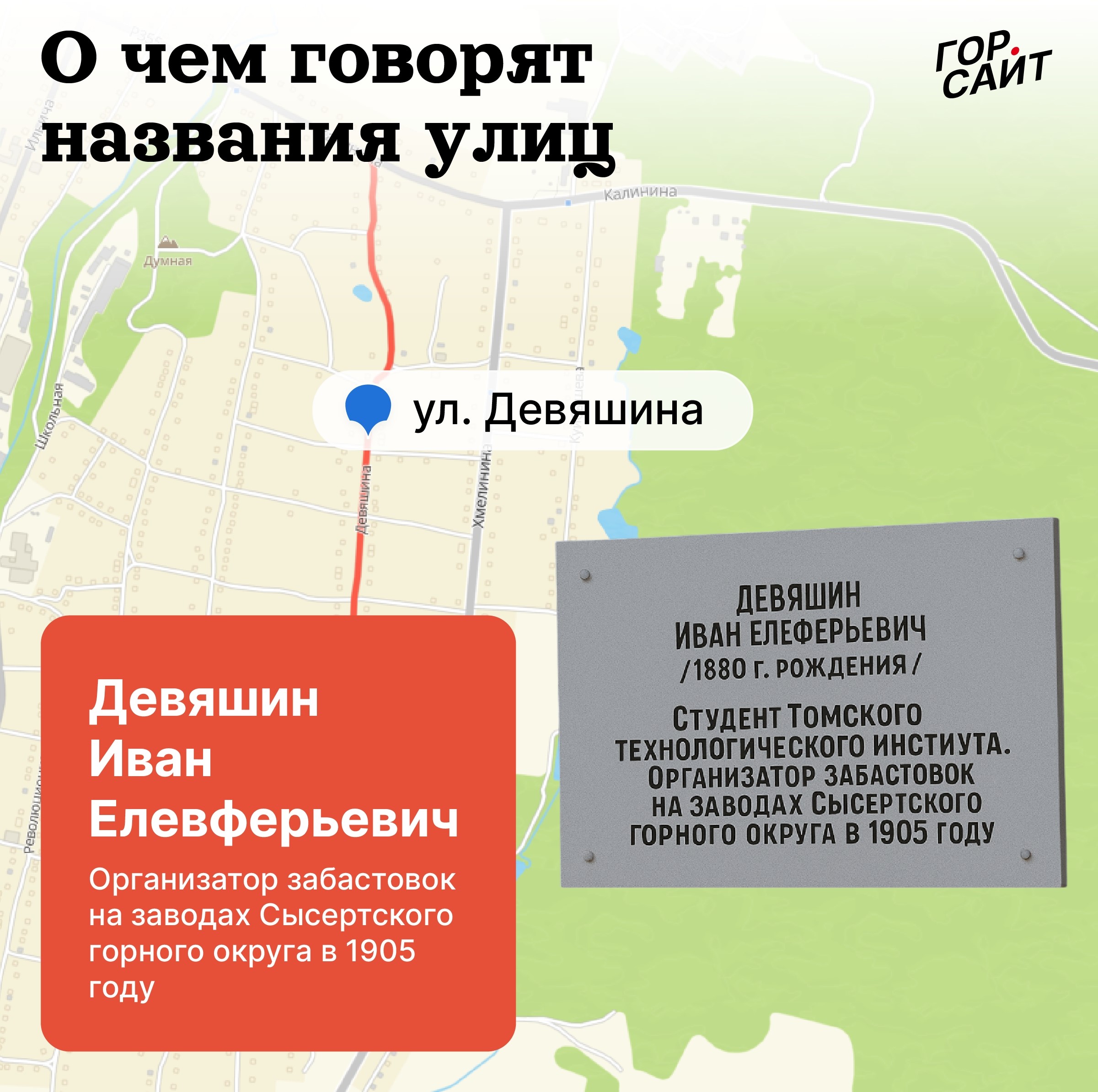 Девяшин Иван Елевферьевич — организатор забастовок на заводах Сысертского горного округа в 1905 году.