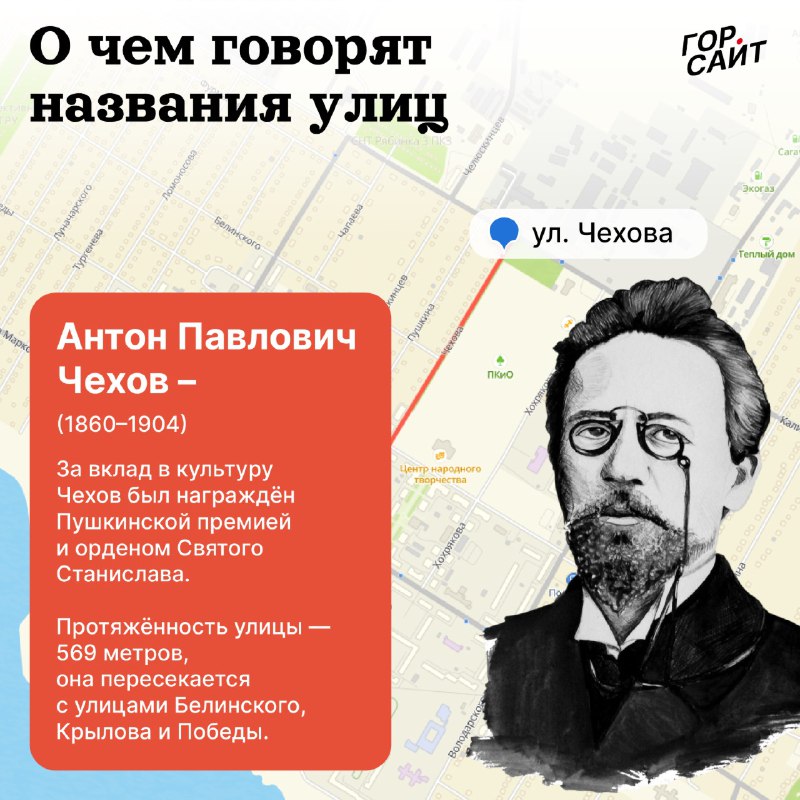 Сегодня мы познакомимся с одной из улиц города, название которой носит имя великого русского писателя и драматурга Антона Павловича Чехова.