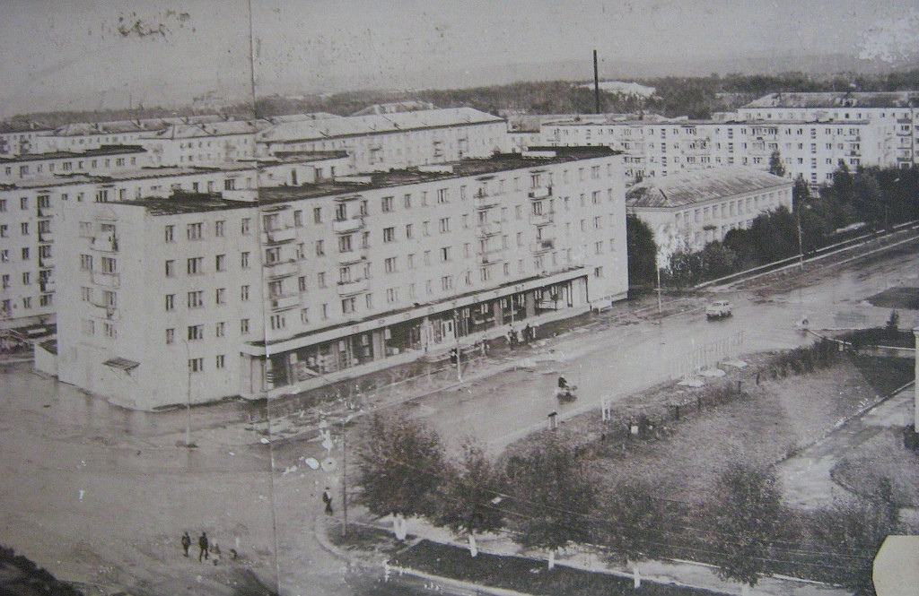 Перекрёсток улиц Карла Маркса — Бажова. В центре фото магазин №42, теперь здесь расположена «Пятёрочка». Рядом находится детский сад. На заднем плане криолитовский санаторий-профилакторий.